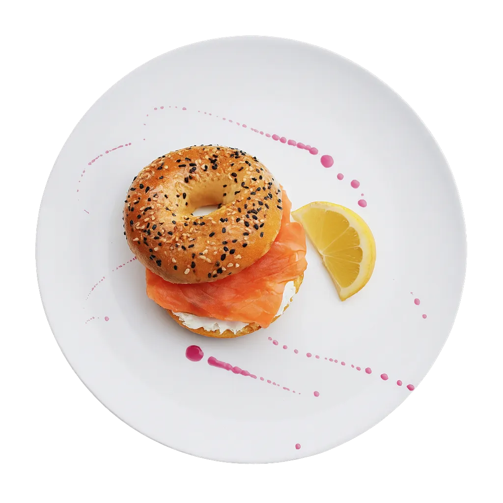 Bagel frais garni de saumon fumé, fromage à la crème et citron.