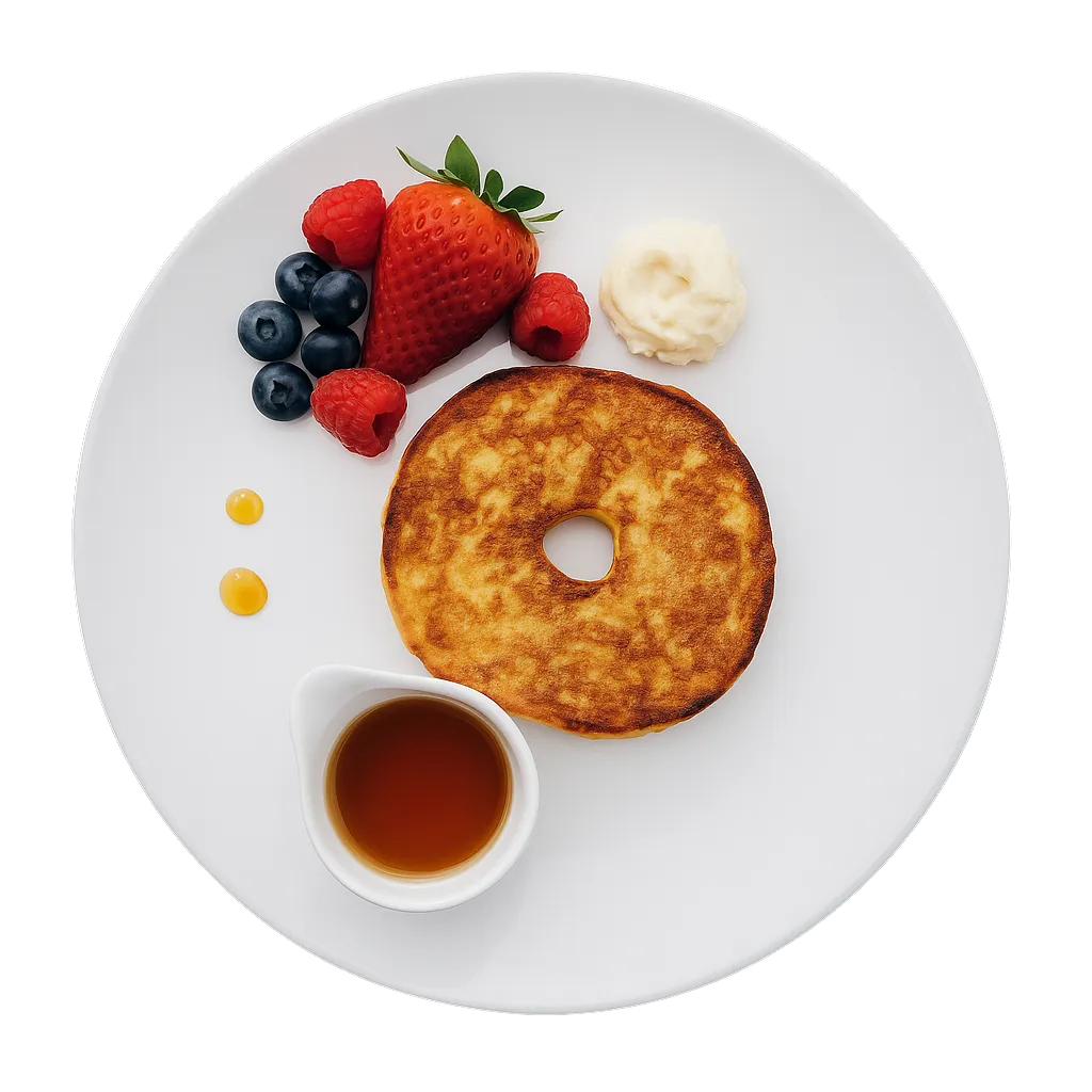 Servi avec petits fruits, beurre d’érable et un filet de sirop d’érable.